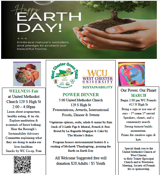 • 2pm: Show your commitment to Earth on our march beginning at West Chester Friends School, 415 N. High St. Bring your own signs or use ours. The march will stop twice to rally and hear from speakers; it will end at the United Methodist Church at 129 S High St. by 3:30pm.