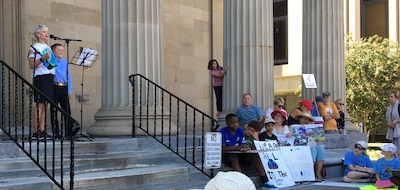 Longtime environment activist mayor Dianne Herrin welcomed the crowd and remarked how far Climate Action has come since Greta Thunberg was sitting on the sidewalk by herself in front of her Stockholm school.
