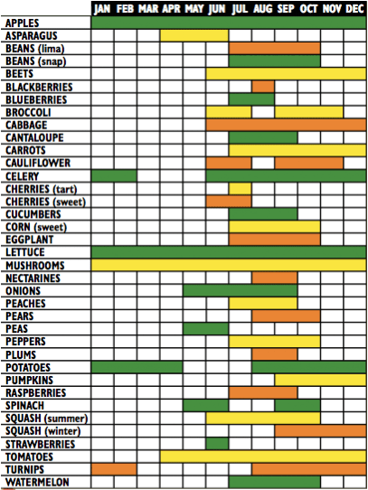 Handy chart of usual local fruit and veg availability in Chester County, from the West Chester Growers Market (N. Church + W. Chestnut Sts., every Saturday, 9-1):