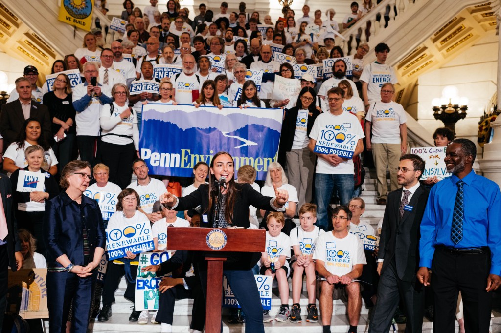 This interview was conducted by Nathaniel Smith by phone on 12/22/20 with Flora Cardoni, Field Director, PennEnvironment (at the mic in the photo). RGGI (the Regional Greenhouse Gas Initiative, pronounced like the name Reggie) is a major avenue for the Commonwealth and people of Pennsylvania to do more in reducing carbon emissions.