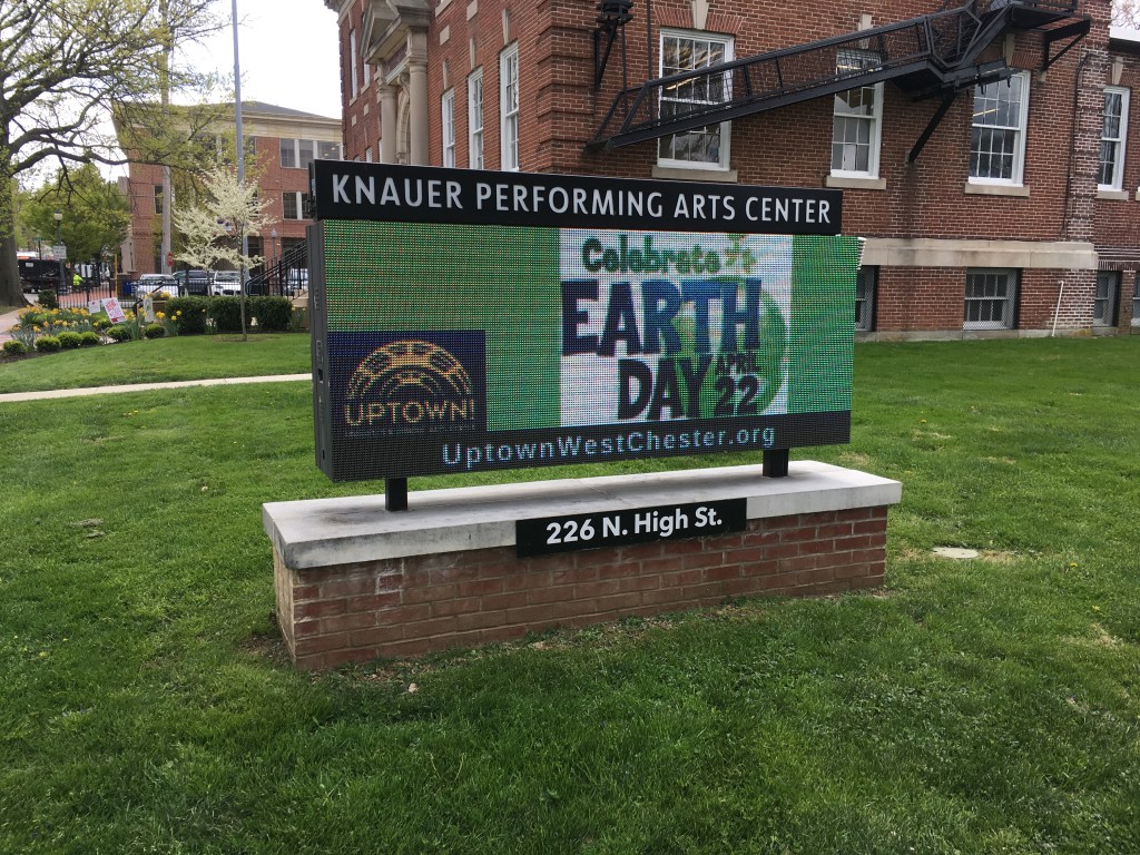 The initial text is from remarks by Borough resident Rani Norley at the opening ceremony outside Phillips Memorial Building, WCU, after her official unveiling of the 2021 Green Team yard sign marking it joining the Transition movement (close-up below; to order, see here) and, despite the blustery morning, surrounded by seasonal flowers. The following photos are of Earth Day art and observances along S. and N. High St. And the text at the end gives our own thoughts on Earth Day.