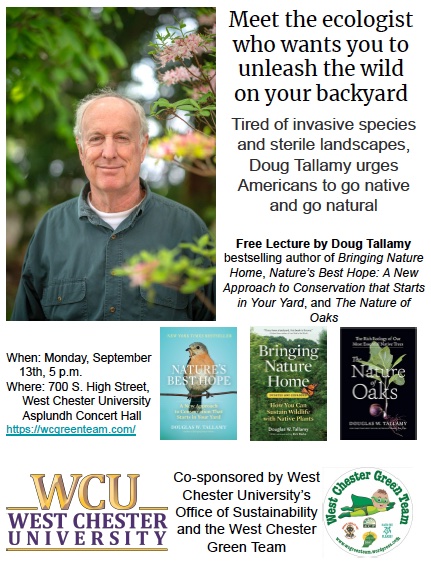 Dr. Doug Tallamy will describe his plan for a grassroots call-to-action to regenerate biodiversity through native plantings in your backyard. Dr. Tallamy, professor in the Department of Entomology and Wildlife Ecology at the University of Delaware, best-selling author, and an international expert on restoring health to the planet through plants, will visit West Chester University on Monday, September 13.