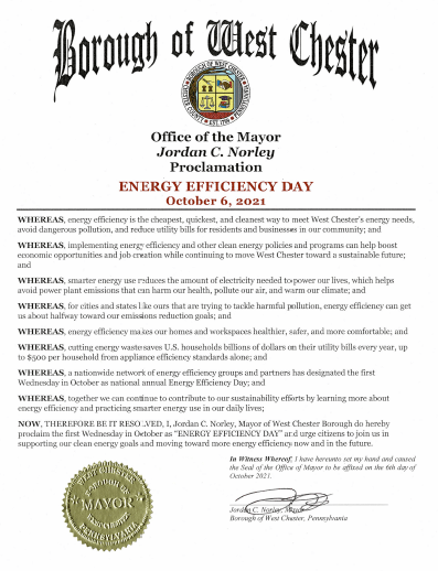 • We celebrated National Energy Efficiency Day with a workshop on Efficiency First! and with declarations from Congresswoman Chrissy Houlahan, the Chester County Commissioners, West Chester Mayor Jordan Norley, and the state legislature. (West Chester proclamation to the left; download County proclamation here.)