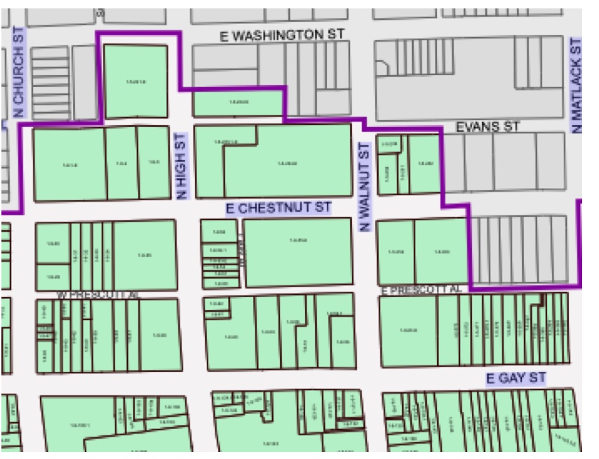 The Chestnut Street Garage is in the middle of the above map from the BID, at the SW corner of E. Chestnut and N. Walnut. The garden lies along the southern edge of the garage, on Prescott Alley.