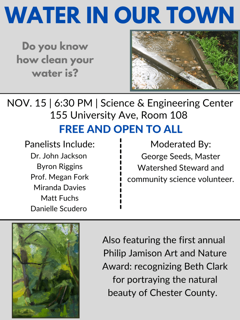 […] November 15: Water in our Town. Prof Megan Fork and 2 student researchers joined Dr. John Jackson of Stroud Water Research Center and Byron Riggins of Delaware Riverkeeper Network. Moderated by George Seeds, Master Watershed Steward and community science volunteer. Preceded by First annual Philip Jamison Art and Nature Award presentation, recognizing local artist Beth Clark for portraying the natural beauty of Chester County. See more info, including a report in the Daily Local News, here. […]
