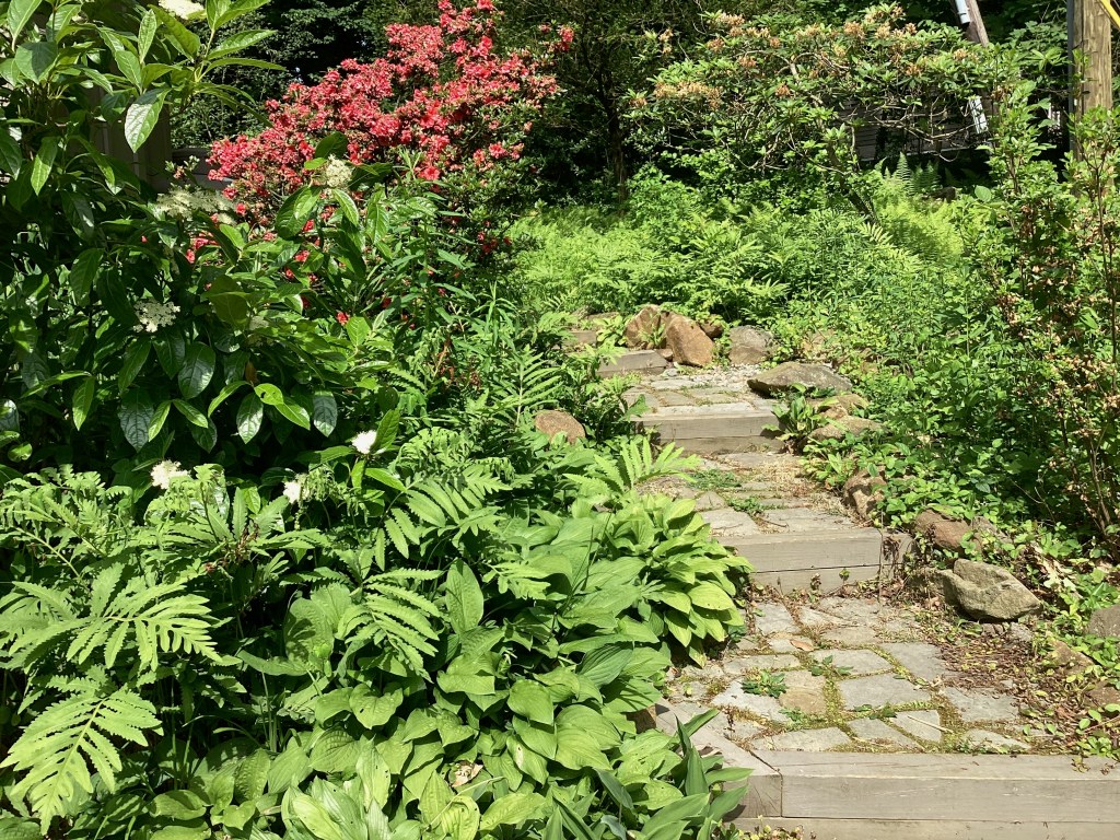 *Please note that we are located on a hillside with uneven paths, stone steps, and wood chips leading to the backyard. The wide front yard can be viewed from street level, but the smaller backyard is not ADA accessible.