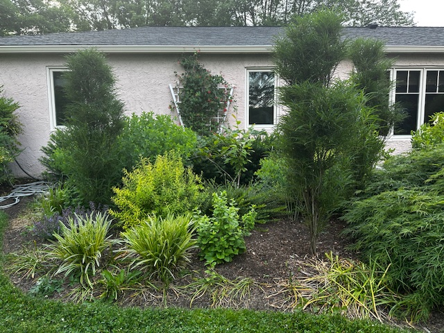This garden has really evolved over 20 years- when we purchased the place- we inherited a young forest of Black Locust trees, which were cut down but repurposed as retaining walls to tame to the slope for installing a vegetable garden in the rear yard. A terrace and fishpond were later carved out of the rear hill. Since adding a raised bed to the veg. garden and incorporating a winter cover- I can raise vegetables on a year-round basis. As a landscape architect, I have used the garden areas to experiment with plants that I could later use in my professional designs. Despite some failures, my success rate has been good; to date, I have 110 trees and shrubs and 385 perennial plants on a property just under ⅓ acre. The consequences of having this many trees and shrubs have changed the environment from a once-sunny yard to having mostly shaded garden beds. Despite the shade, we managed to add solar panels to the roof two years ago. This year’s introduction is a “Bee Lawn”- which replaced an area of a turf lawn.
