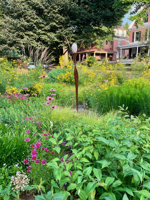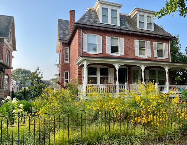 In 2011, we completed the rehabilitation of our 1887 twin home, designed by T. Roney Williamson, architect of the First West Chester Fire Company, and West Chester Public Library in the Queen Anne Revival Style. With a goal of maximizing the sustainability of the dwelling while preserving its historic character, we built a rainwater collection system and a 1500-gallon underground tank for garden watering; installed 4 geothermal wells and geothermal HVAC system, used all built-in LED lighting (which was quite unusual at the time), dual-flush toilets, and other green features. For the landscape, we removed invasive bamboo, other invasives, and sod from the front yard, then covered everything with a 4-inch layer of wood chips over 4 inches of topsoil, and proceeded with planting a combination of native and non-native plants to create what has become known as “the natural garden,” as defined and elaborated by Henk Gerritsen and Piet Oudolf, landscape architect and designer of the High Line in New York City. A few years later we added a garage with a green roof, designed in the form of a slat house referring to Wiliam Everhart’s garden house in the side yard of his mansion a few blocks away on the 100 block of West Miner Street. With heavy shade in the backyard, the only location for a sunny herb garden was either the front or side yard. We opted for the side yard, and now enjoy fresh herbs from the side yard and full-sun perennials in the front yard, which bring us great pleasure while providing a gift to the street. A list of the medical and culinary herbs will be available on the day of the tour.