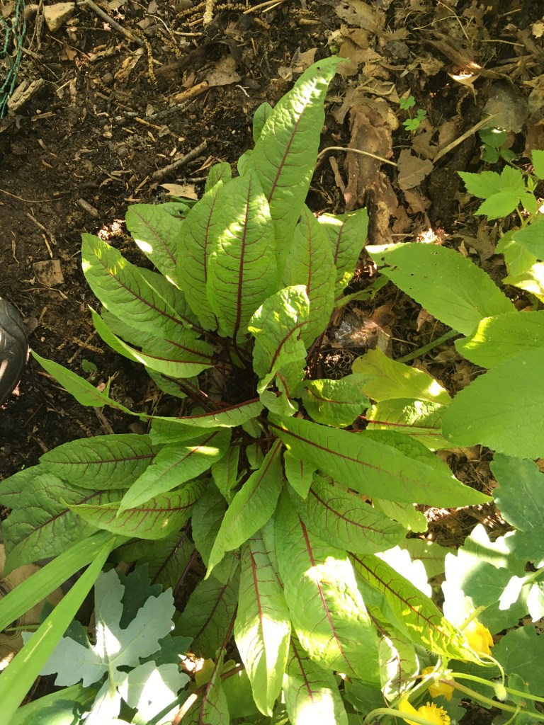 • We can open ourselves to surprise by giving unknown plants a chance to declare themselves before we weed. Plants can unexpectedly overwinter or self-seed, or appear from unknown sources. This bloody sorrel, a red-veined spinach-like leaf crop with an unfortunate name, must have been strategically carried into the vegetable garden by a passing bird.