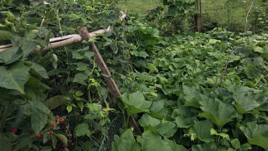 If squash wants to grow twenty-foot vines, should we interfere? It’s a question of philosophy: some of us would give it free rein, even at the expense of other plantings being submerged; others of us would severely restrict it to its appointed space.