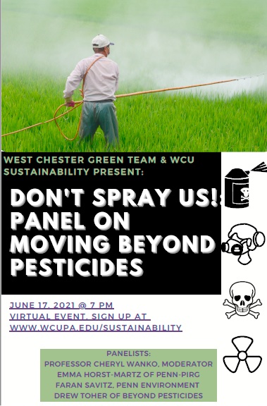 “Don’t Spray Us!: Panel Discussion on Moving Beyond Pesticides” on June 17, 2021, brought together knowledgeable panelists to speak to local issues concerning the use of pesticides and the alternatives that may exist. Panelists included Emma Horst-Martz with PennPIRG, Kara Rubio of Women for a Healthy Environment, and Drew Toher with Beyond Pesticides. The discussion was moderated by Professor Cheryl Wanko of West Chester University. View the full discussion at the WCU Office of Sustainability.