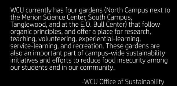 See videos about WCU’s North Campus Organic Garden with Elizabeth Schultz (WCU ’21) here and of South Campus Gardens here.