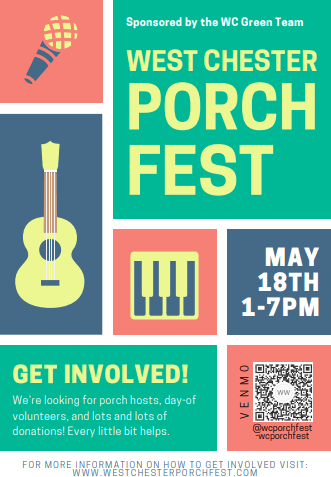 We founded in 2021 and continue to lead West Chester Area Transition, an organization dedicated to enhancing community activity in the context of sustainable living, involvement of children, and enjoyment of our surroundings. See more information here. One of Transition’s salient initiatives is the annual West Chester Porchfest, a large community-oriented music festival including information on green living and many activities (see separate web site here).